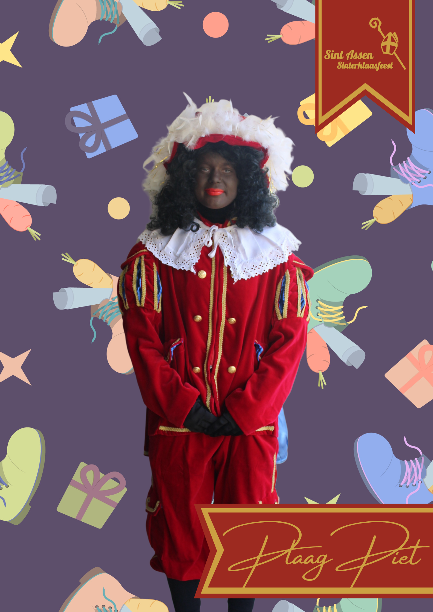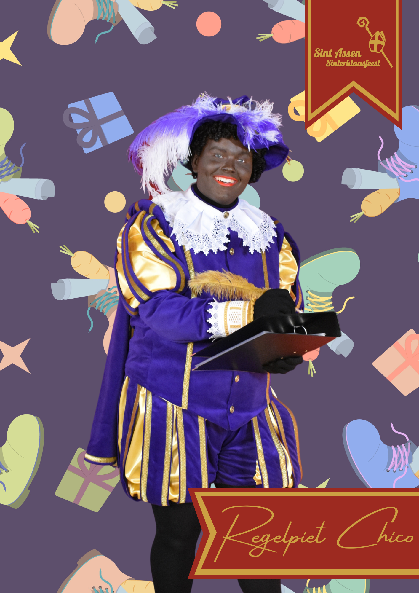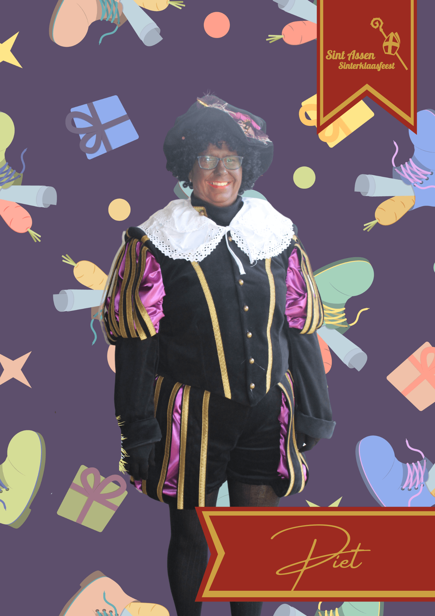 Hier ben ik dan, Hoofd Piet! Samen met Sinterklaas kom ik op de meest leuke plekken! Naast de intocht ga ik graag mee naar bedrijfsbezoeken familiebezoeken en schoolbezoeken! Vaak zie je mij lopen met het grote boek van Sinterklaas. Ook over jou staat er iets in het grote boek! Als Sinterklaas even niet oplet dan proef ik graag van de lekkere hapjes die op tafel staan met pakjesavond. Favoriet is droge worst, daar kan ik moeilijk van af blijven!